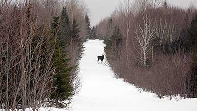 As we left last time, we had just gotten out on the trail and were headed around the corner. We were on a nice groomed trail and there was a big bull moose in our way. Yes, I know he was a bull, I personally saw where he made the snow yellow.